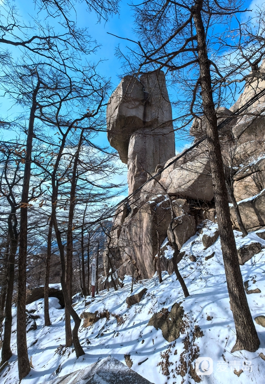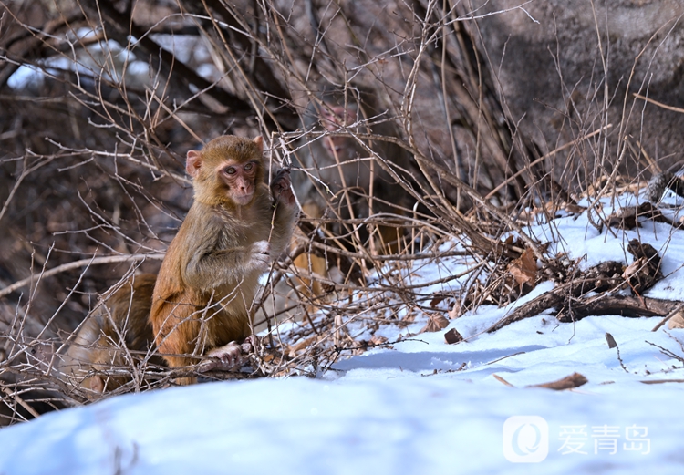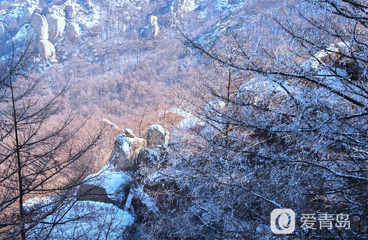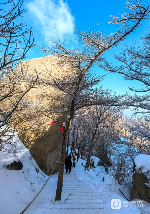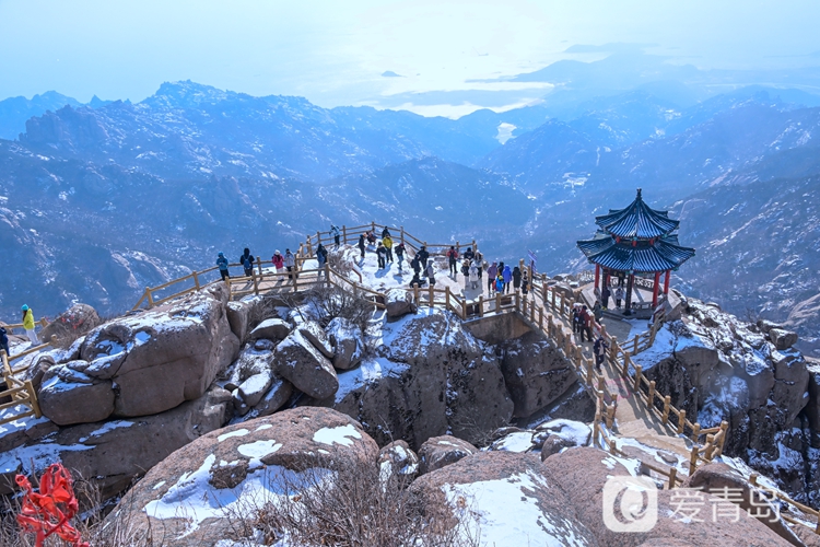放眼望去,崂山巨峰主峰如银龙卧海,皑皑白雪勾勒出山峰刚劲的轮廓,与深色山岩形成鲜明的对比,宛如一幅泼墨写意的山水画卷。
