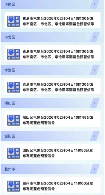 青岛多个区市的寒潮蓝色预警信号