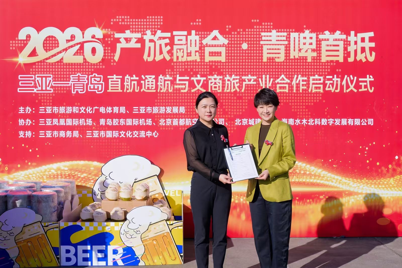 QMG青岛广电2月5日讯 2月4日上午,“2026产旅融合・青啤首抵——三亚-青岛直航通航与文商旅产业合作启动仪式”在三亚凤凰国际机场举行。此次仪式的举办,标志着青岛与三亚正式打通“特色物资直航+文商旅产业联动”双向通道,为两地跨区域协同发展注入强劲新动能。