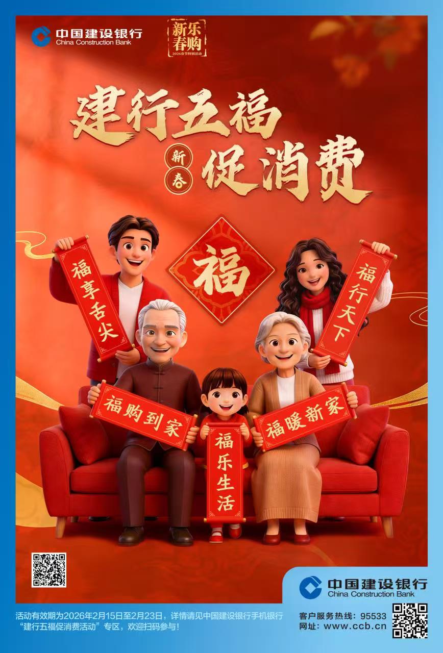 近日,建设银行积极响应商务部等9部委2026“乐购新春”春节特别活动号召,启动2026年春节促消费专项活动,紧密围绕人民群众“好吃、好住、好行、好游、好购、好玩”核心需求,以“福享舌尖、福暖新家、福行天下、福购到家、福乐生活”为主题,精心策划开展15项惠民活动,并集中推出微信立减金、消费券、数字人民币智能合约红包、支付满减、利率优惠等多重权益,助力实现马年消费“开门红”。
