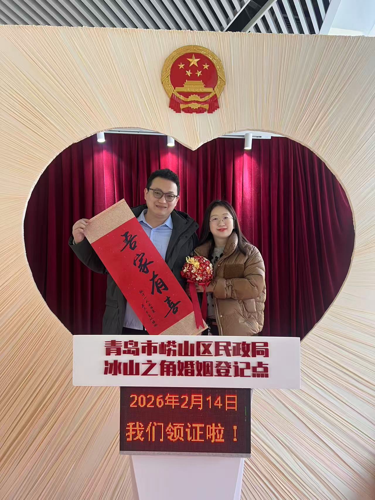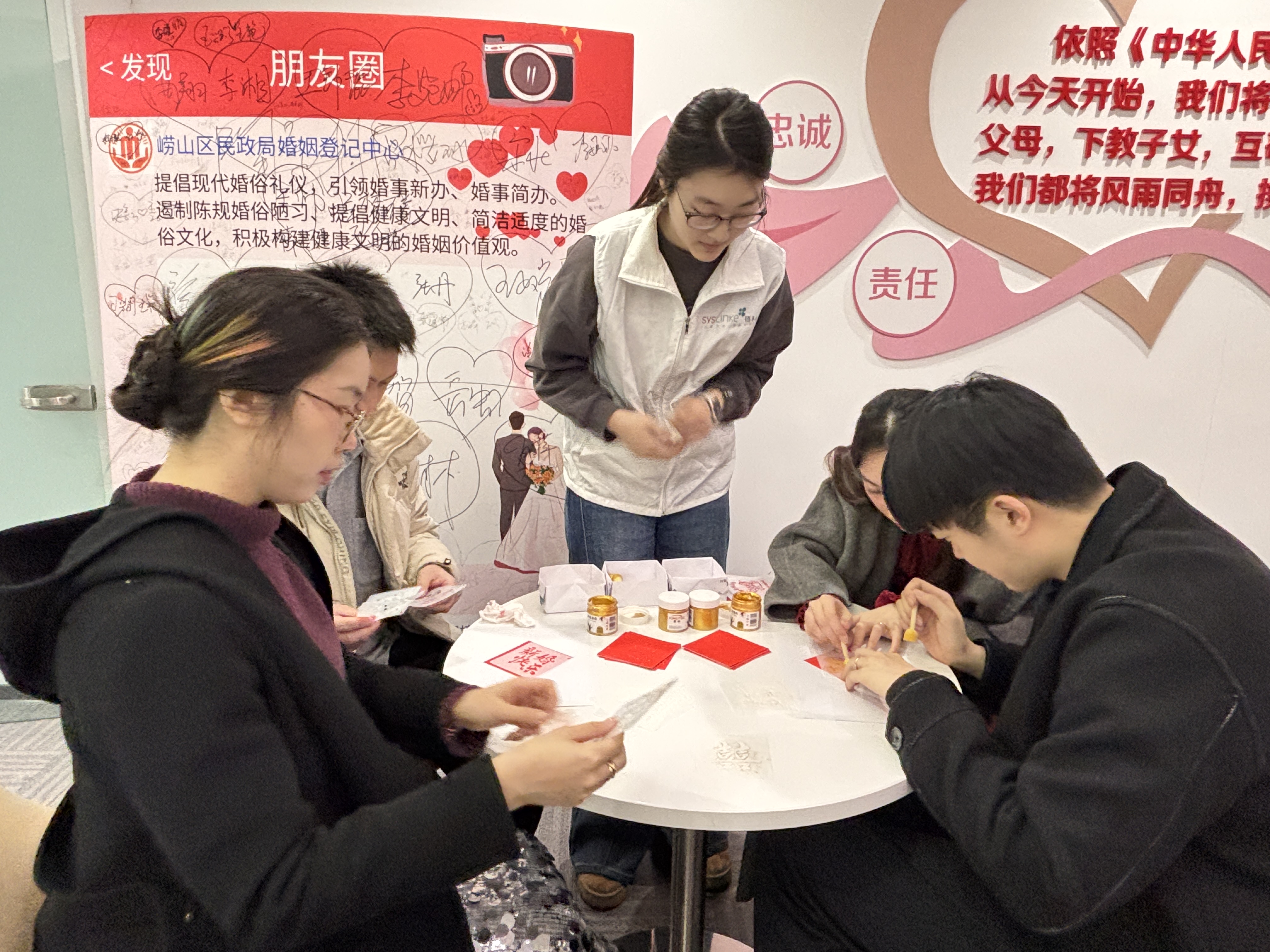 QMG青岛广电2月14日讯 “今日共拓一纸囍,来日同书一生情。”2026年2月14日,在崂山区民政局婚姻登记中心的指导下,崂山区链科社会工作服务中心为新人带来“囍字拓印见证爱”新婚赋能大型活动。