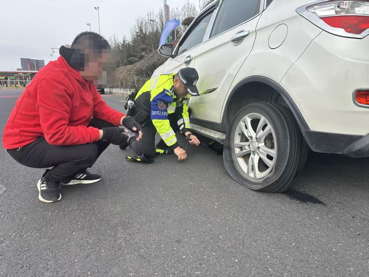 2月16日15时50分许,交管城区高架路大队执勤民警发现一辆小型越野车停在胶州湾隧道收费站外,立即上前了解情况。原来,驾驶人驾车行驶到此处发现左后胎漏气无法继续行驶。民警立即在车辆后方做好安全防护,并帮助驾驶人更换备胎。十几分钟后,备胎更换完毕,民警叮嘱驾驶人尽快到维修店做进一步检查,并送上节日祝福,驾驶人对民警的热心帮助表示感谢。