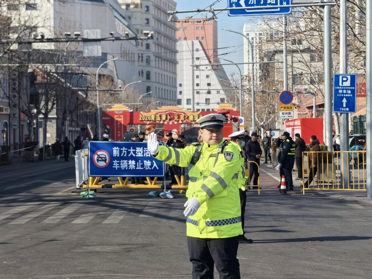 为保障2026年青岛萝卜·元宵·糖球会交通秩序,交管市北区大队对大鲍岛会场实施交通管制与定向疏导,发布绕行路线与停车指引,倡导绿色出行,全力保障节会期间道路安全有序。