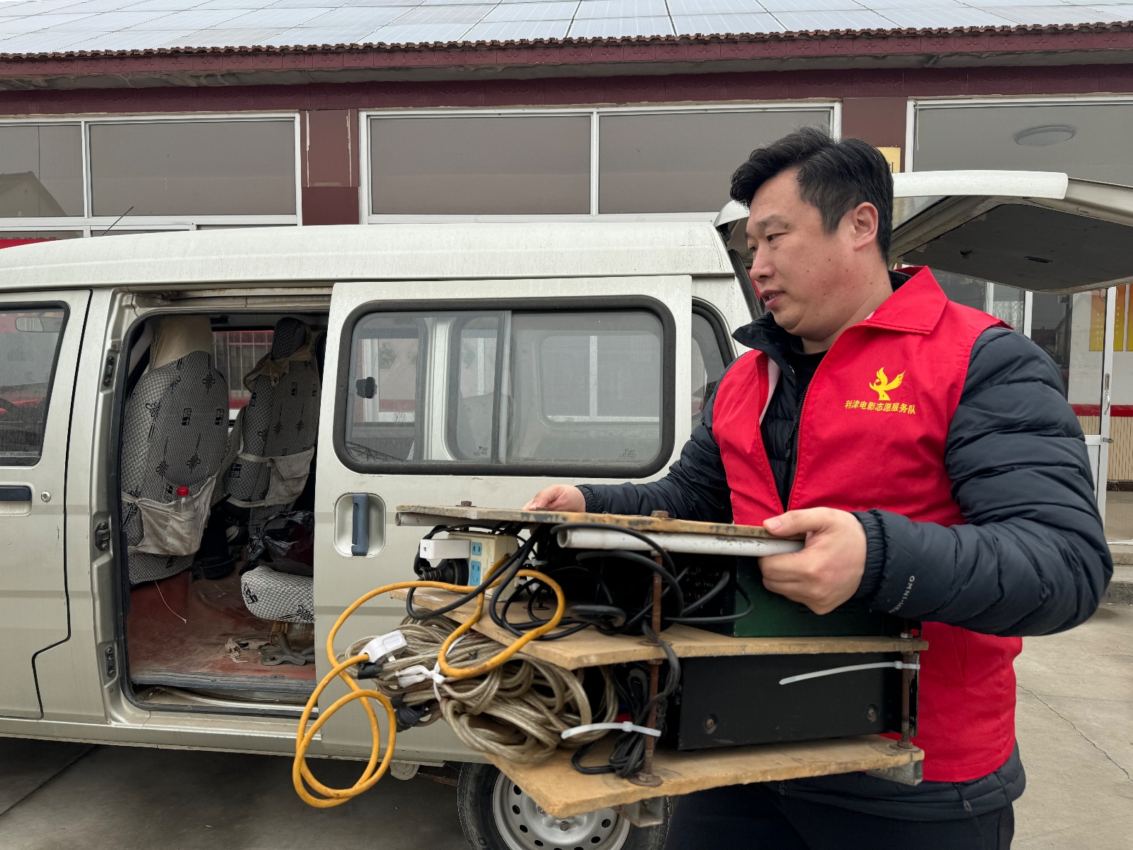 农历腊月二十三,小年。中午十二点,纪师傅发动了他的面包车,从利津县城赶往中古店一村,将近一个小时的车程。他握着方向盘,听见后备箱里传来轻微的响动——那是放映机、幕布、音响设备正随着车身轻轻摇晃。