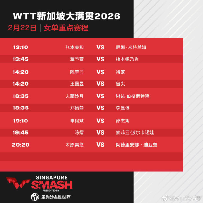 今天(22日),2026年WTT新加坡大满贯正赛打响,首日国乒8人出战,具体赛程如下: