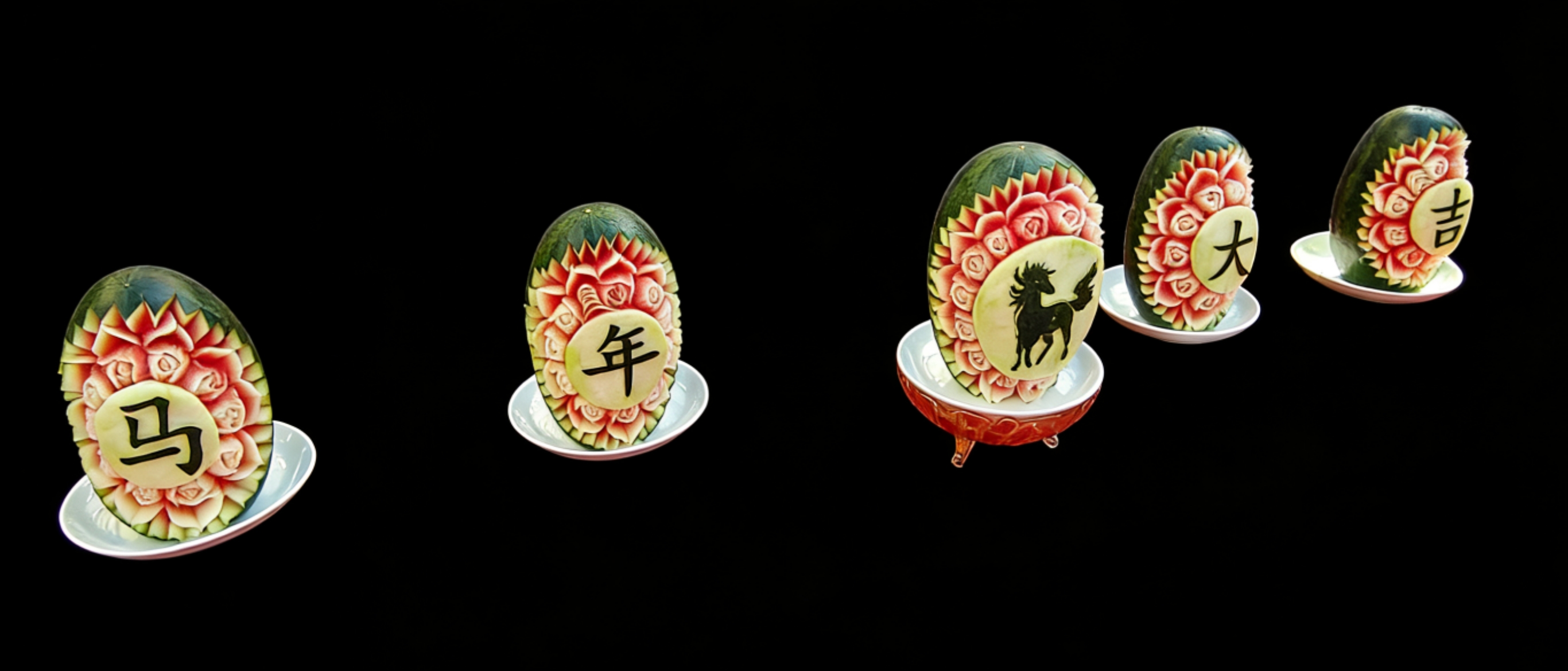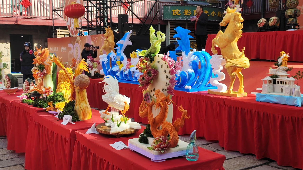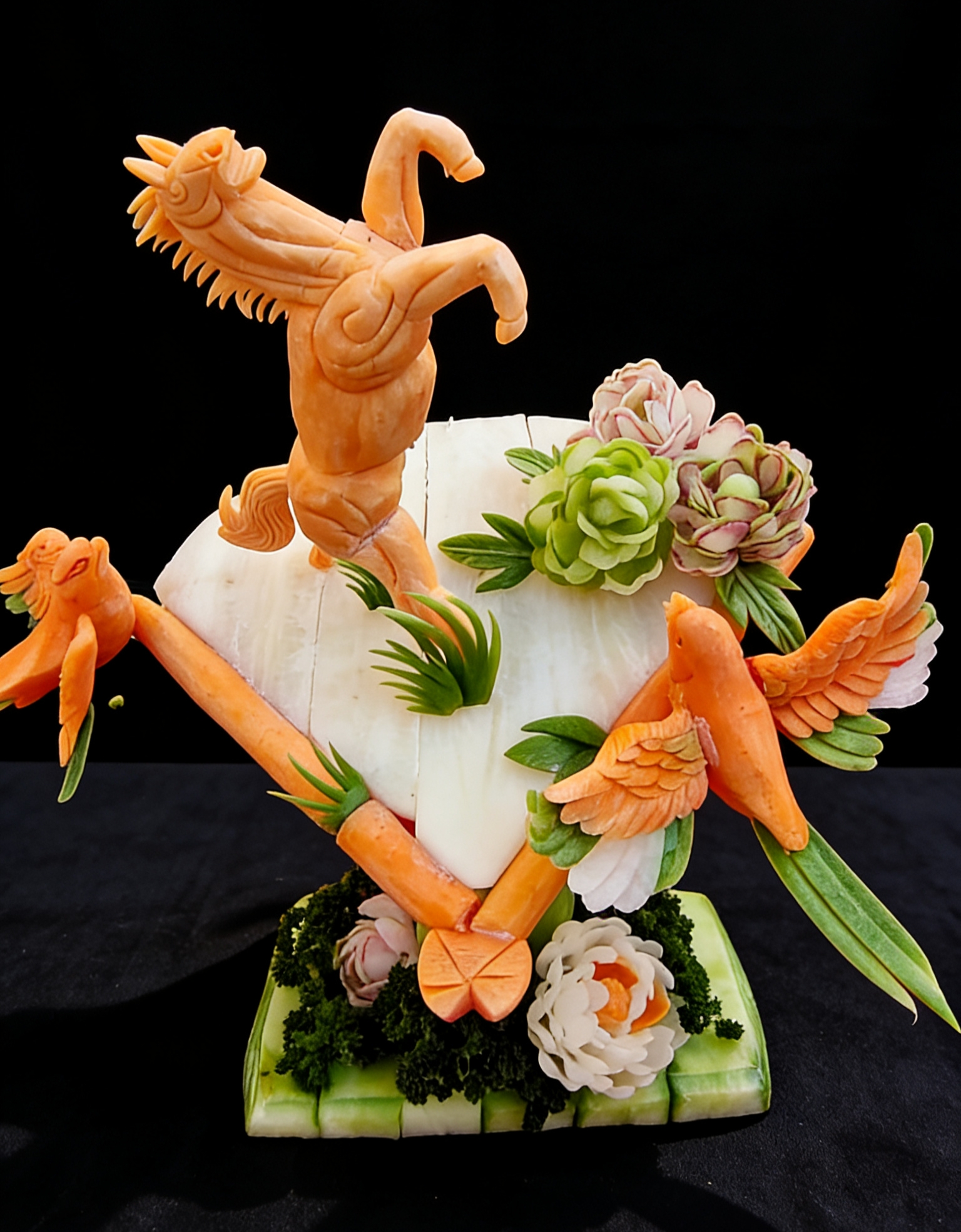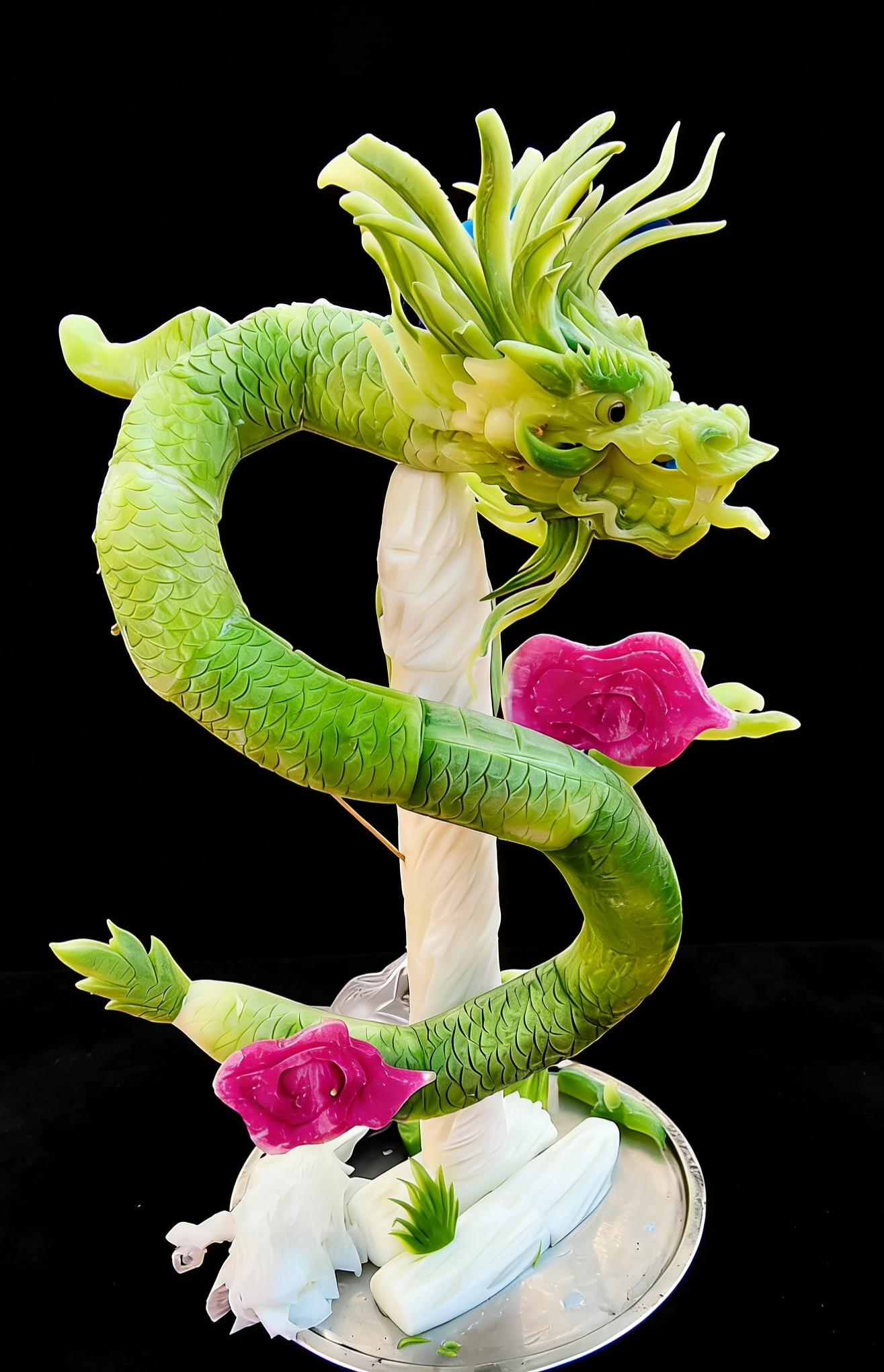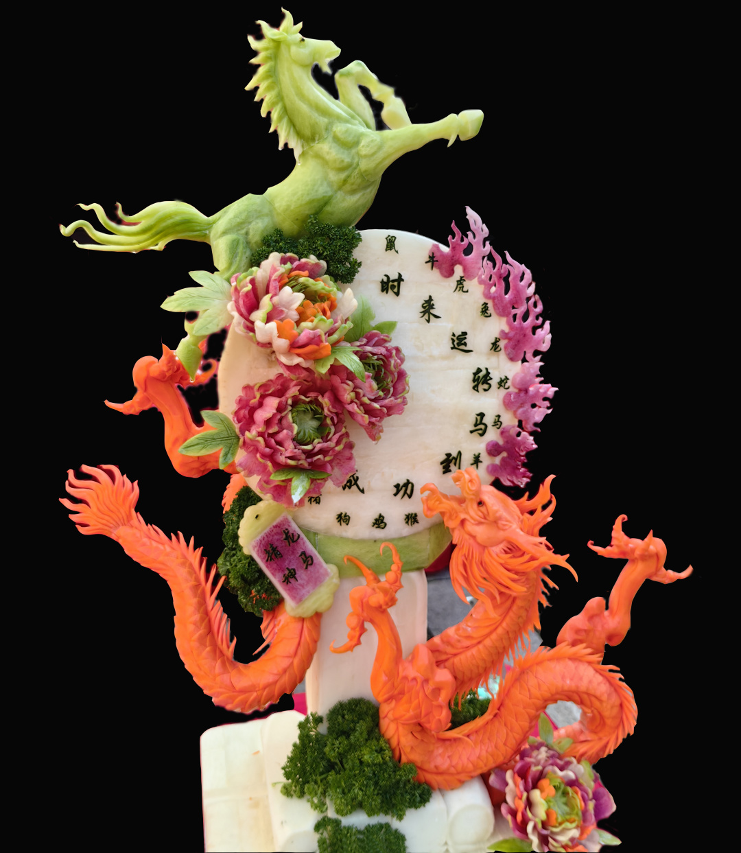 两侧胡萝卜雕就的祥龙矫健盘旋
