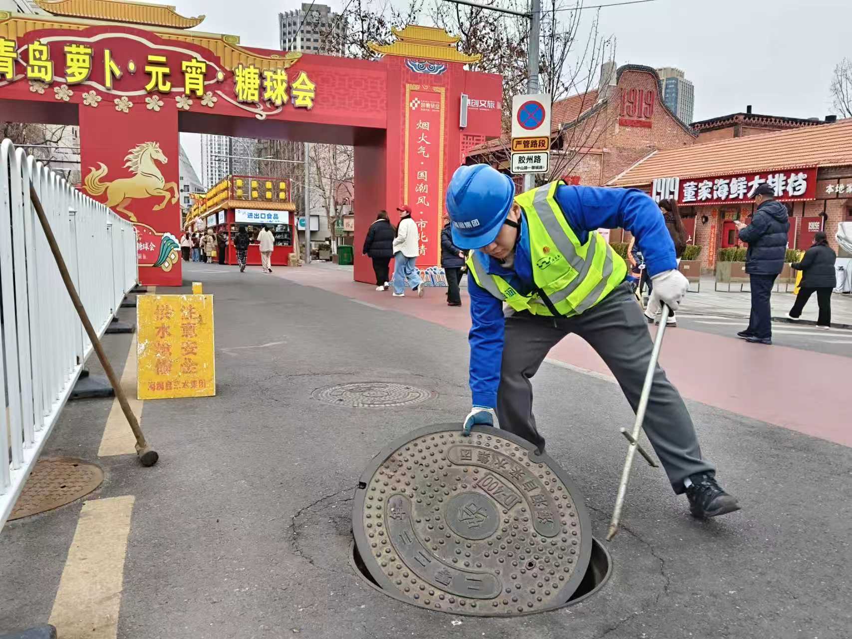 QMG青岛广电2月27日讯 2026年青岛萝卜·元宵·糖球会正如火如荼地进行,街头巷尾人流如织、热闹非凡,处处洋溢着浓浓的烟火气。在这场岛城新春极具人气的民俗盛会,有一群年轻的供水人正默默穿梭于热闹的街巷,用脚步丈量责任,用青春守护城市的“生命线”。