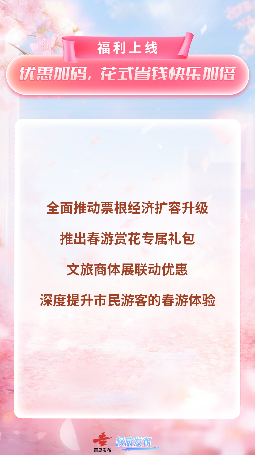 又是一年芳草绿,依然十里杏花红。初春三月是播种希望、邂逅美好的时节,以“面朝大海 春暖花开”为诚挚邀约,以遍布青岛全域的丰富文旅活动、实实在在的惠民政策和便捷舒适的赏花体验,诚挚邀请广大市民和游客走进春天的青岛,漫步花间、聆听山海,共同感受这座海滨城市焕发的无限生机与魅力!