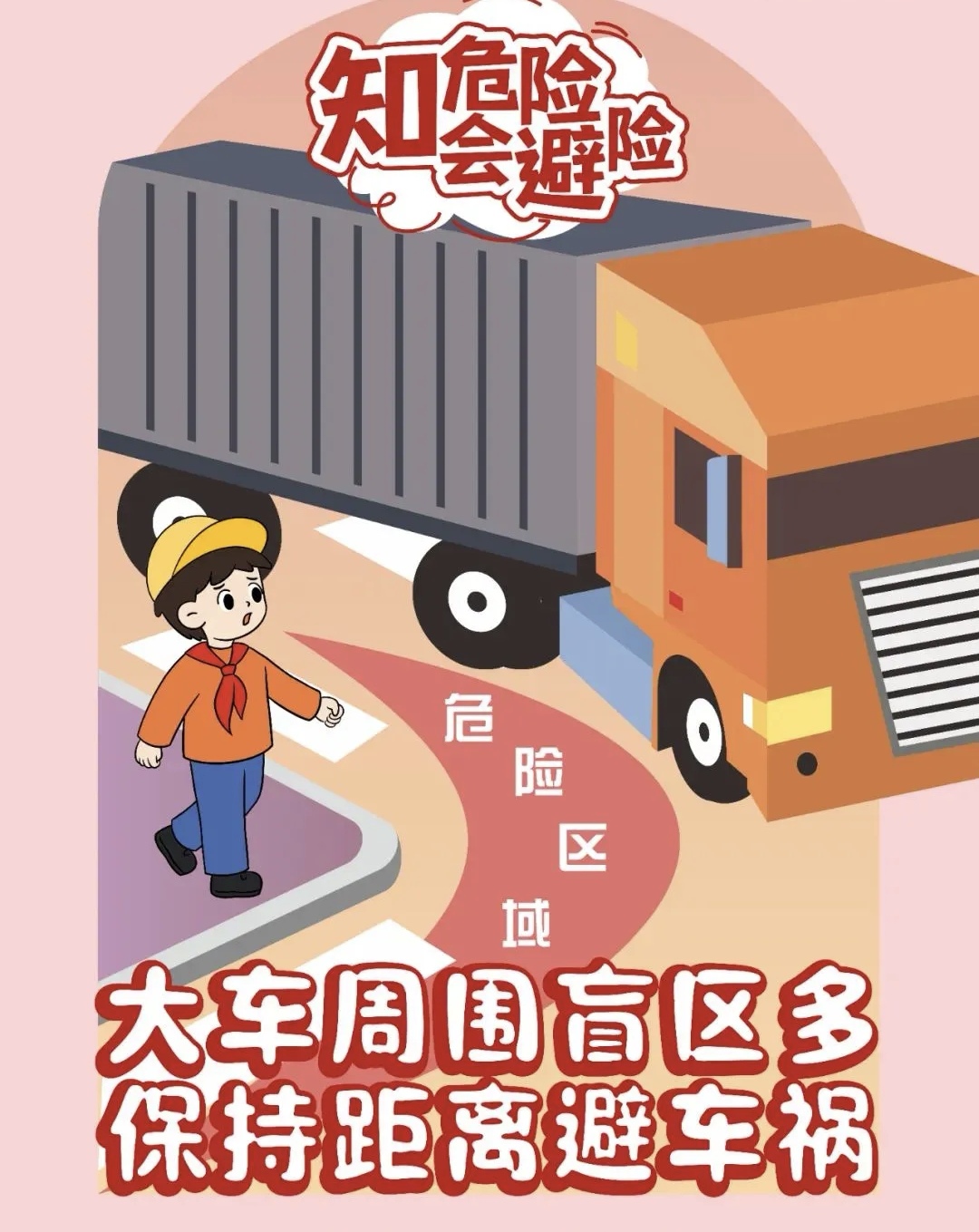 不在车辆周围玩耍逗留,尤其是停车场、小区出入口;在路上遇到大货车、公交车转弯时,请务必退到安全线(2米)以外,且不要和大车抢行,警惕“内轮差”盲区。