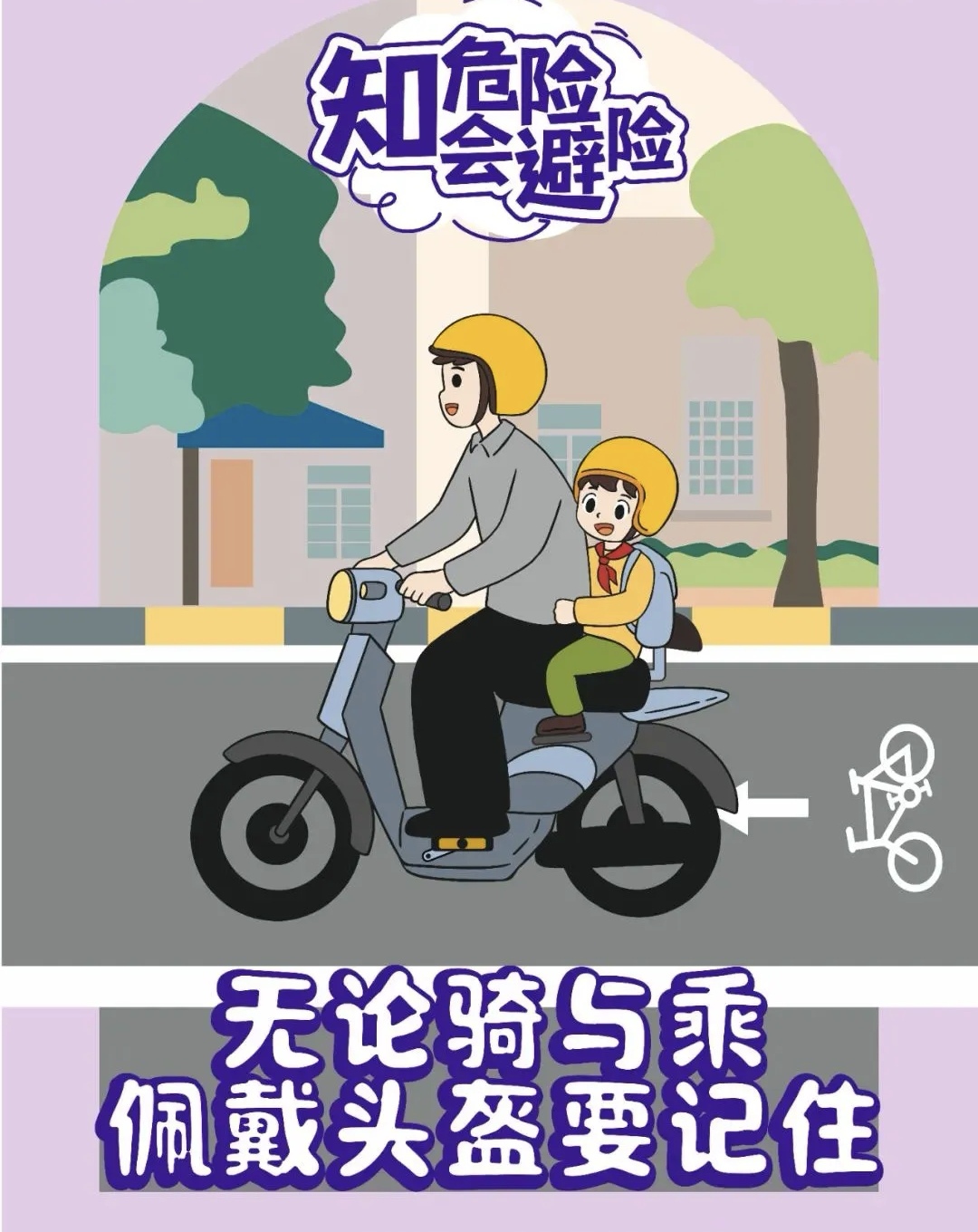 驾驶机动车接送孩子时,请确保全员全程系好安全带,提醒孩子开门下车前,务必观察后方来车;骑行电动自行车接送孩子时,家长和孩子都必须规范佩戴安全头盔;牢记“车上不超员,路上不抢行”。