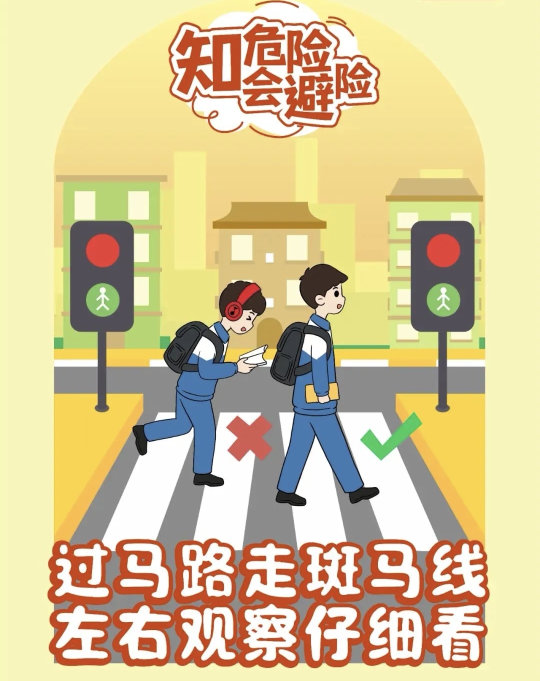 走路上下学的同学,走路时要集中注意力,走人行道或者人行横道线,过马路要做到“一停、二看、三通过”,不闯红灯、不翻越隔离栏,不追逐打闹、不看手机、不突然猛跑,遵守“红灯停、绿灯行”,黄灯亮了等一等。