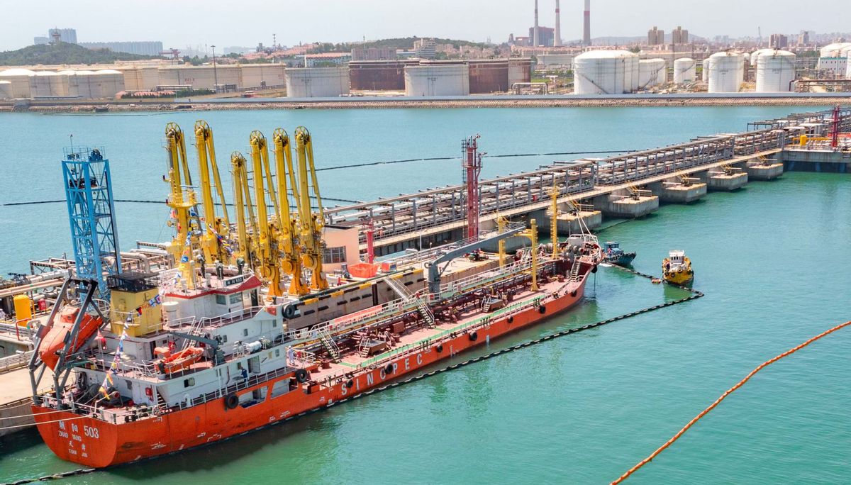 近日,中国石化青岛石油化工有限责任公司生产的2.7万吨国产低硫燃料油,直接输入青岛港鑫油品有限公司“两仓”功能叠加专用储罐,通过账册流转的便捷方式,快速完成国产油到保税油的属性转换,未来可以直接出仓供应国际航行船舶。