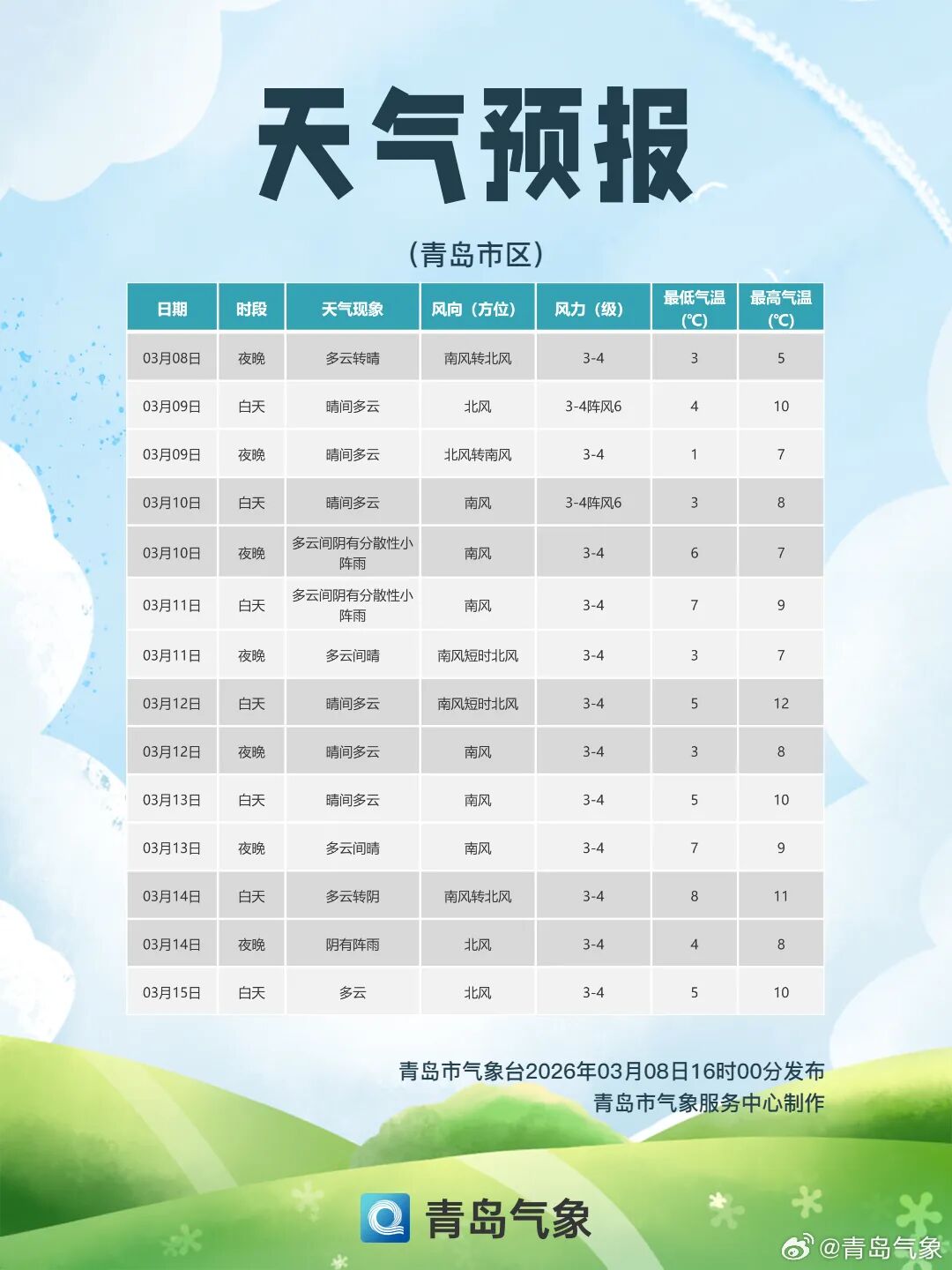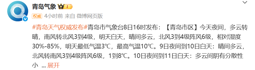 【青岛市区】9日白天,晴间多云,北风3到4级阵风6级,相对湿度30%~85%,9日最低气温3℃,最高气温10℃。