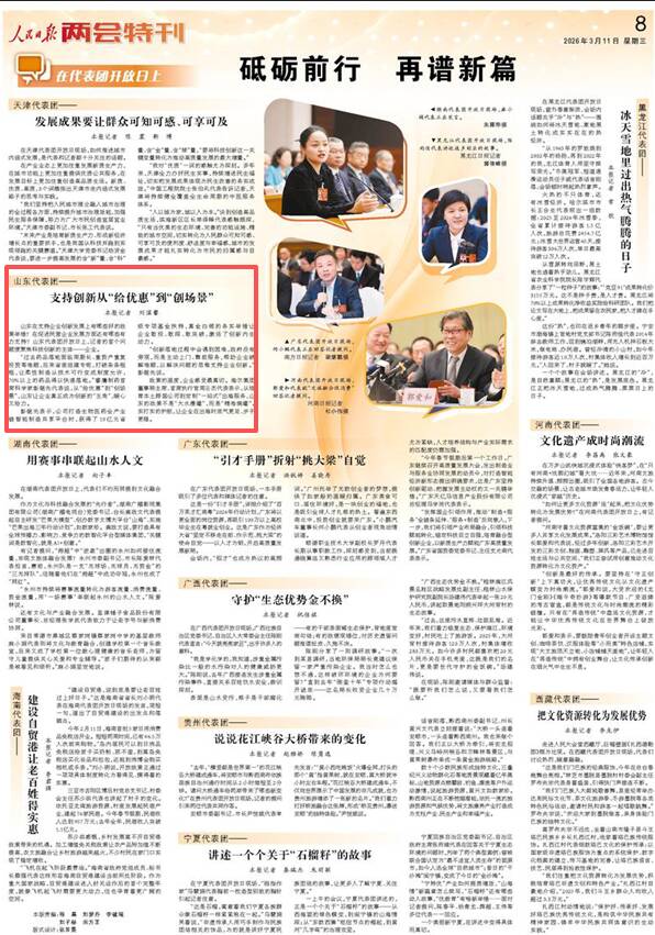 今天出版的《人民日报》第8版,以《砥砺前行 再谱新篇(在代表团开放日上)》为题,聚焦山东代表团开放日:支持创新从“给优惠”到“创场景”,以下为报道全文节选: