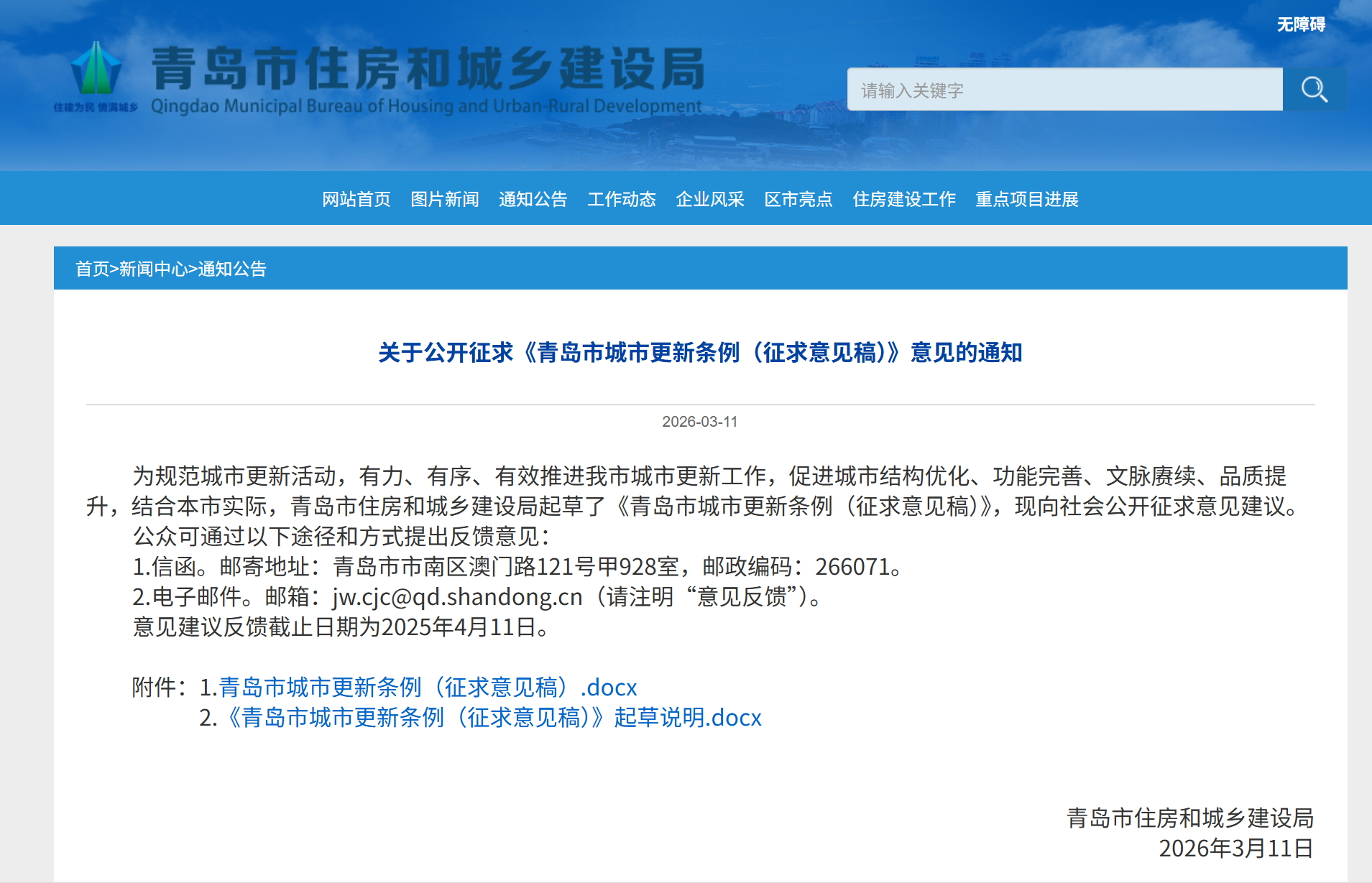 当前,我国城市发展已经由大规模增量建设转为存量提质改造和增量结构调整并重,进入城市更新的重要时期。为规范城市更新活动,有力、有序、有效推进我市城市更新工作,促进城市结构优化、功能完善、文脉赓续、品质提升,结合本市实际,青岛市住房和城乡建设局起草了《青岛市城市更新条例(征求意见稿)》(以下简称《征求意见稿》),现向社会公开征求意见建议。