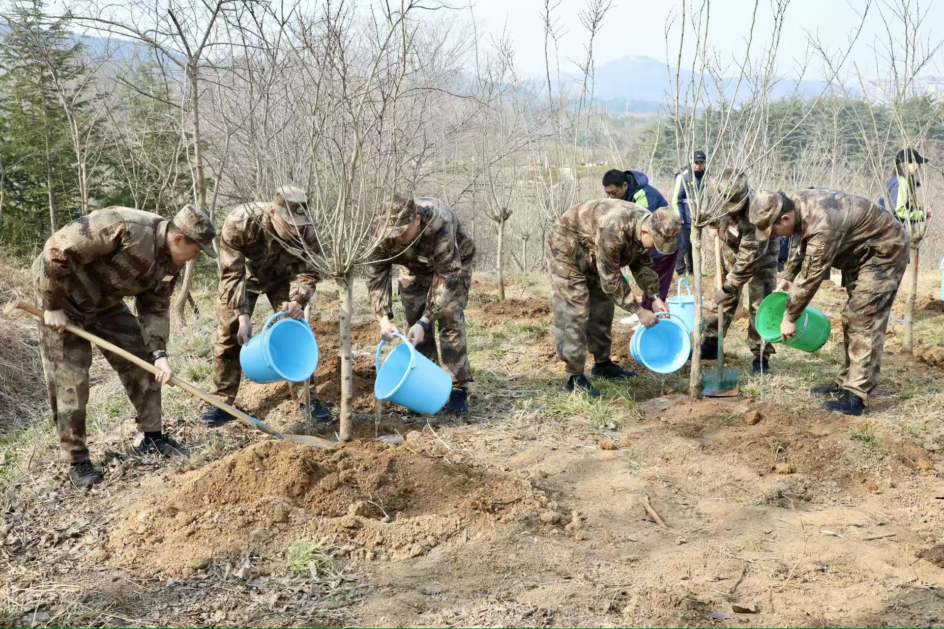 上午9时,预定新兵身着迷彩服,手持铁锹、水桶等工具,齐聚浮山,大家分工协作,挥锹铲土、扶苗填坑、培土浇水,每一个环节都井然有序。经过数小时的辛勤劳动,几十株树苗被整齐栽种,迎风挺立,为春日的市北区增添了一抹生机勃勃的绿色。