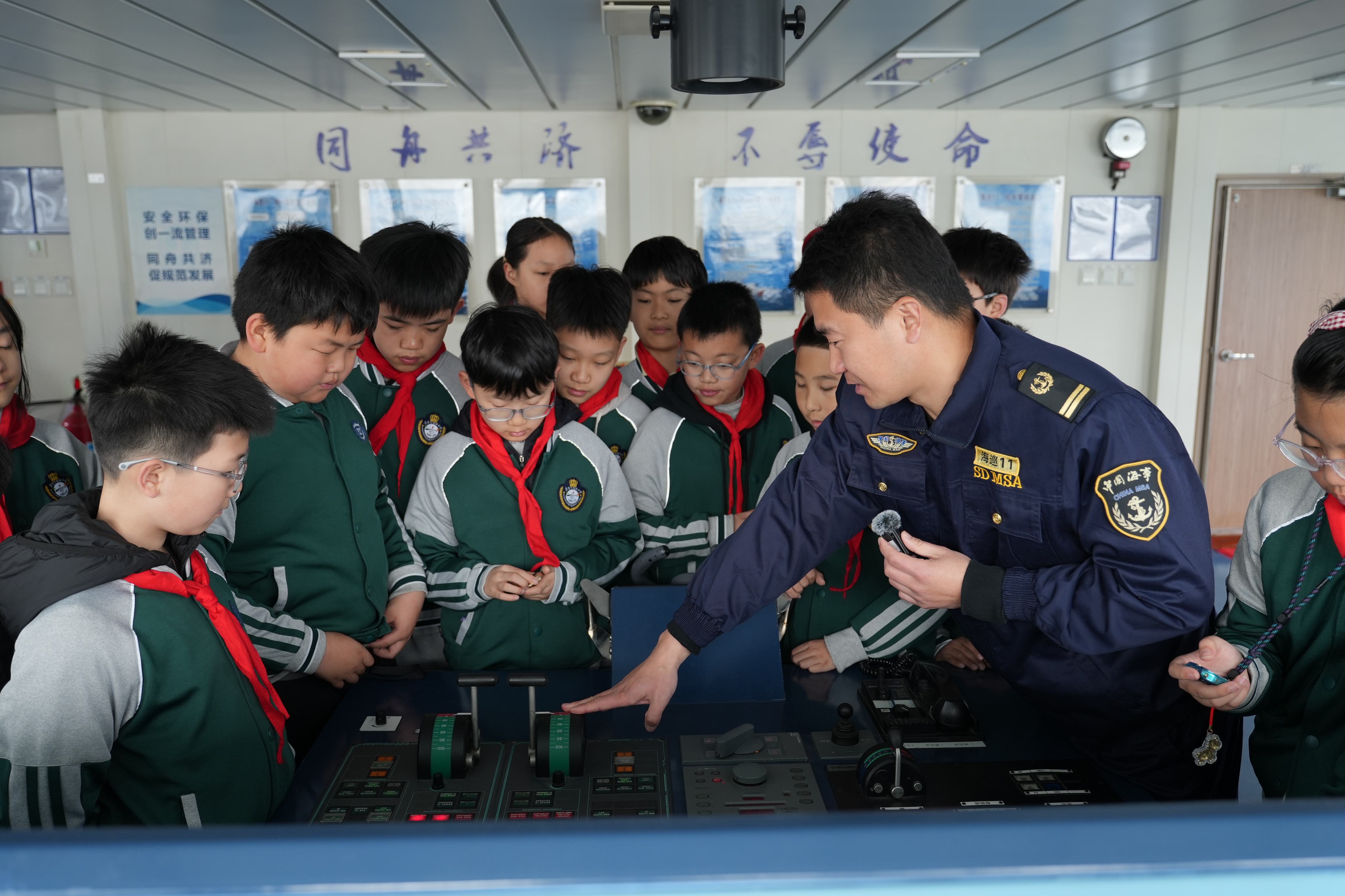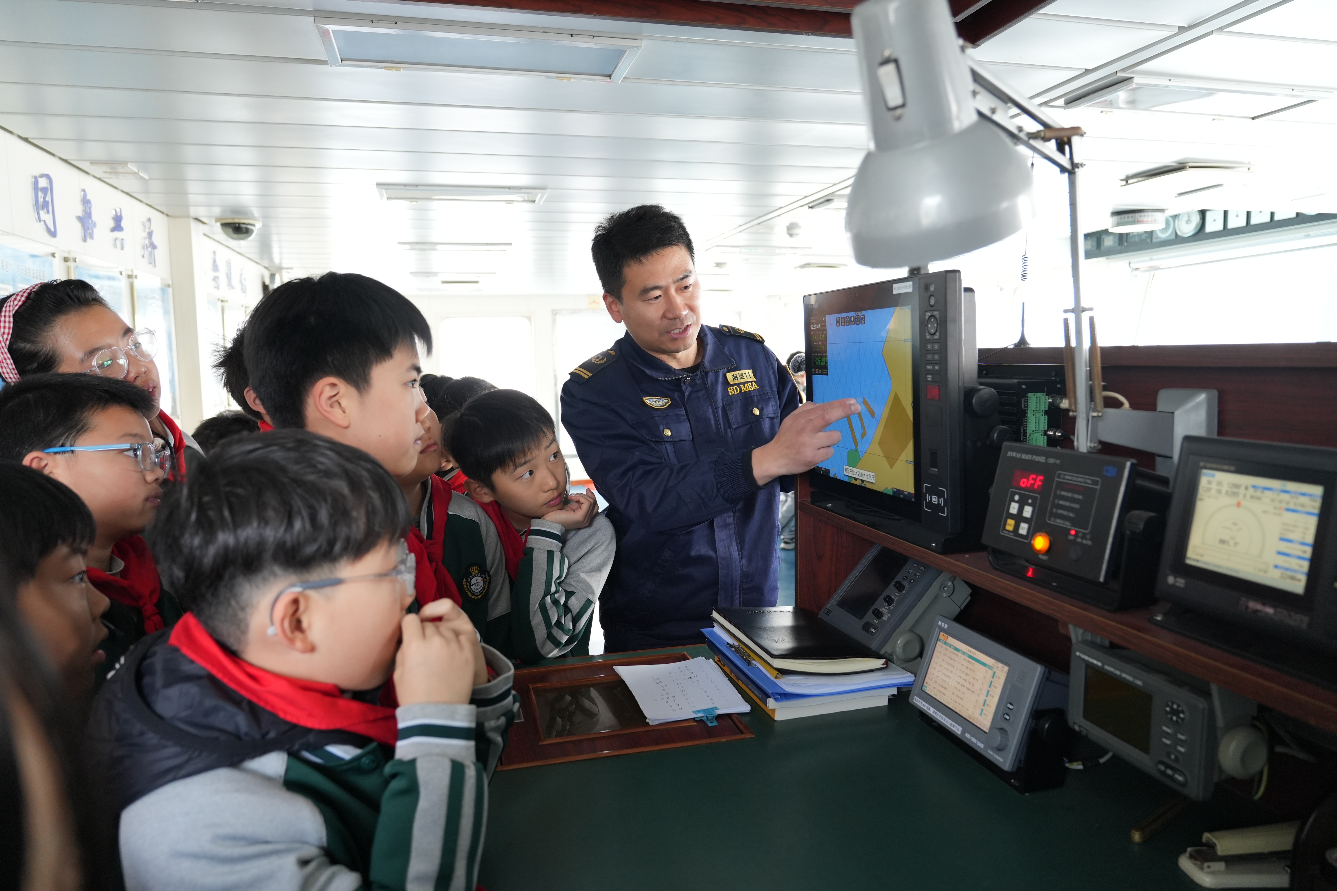 在“探秘海巡11”环节,同学们分组走进船舶驾驶台。雷达屏幕上的光点、罗经的精准指向、先进的通讯设备……一切对于孩子们而言都充满了新奇与神秘。在工作人员的指导下,同学们轮流体验了“小小船长”的角色,手握舵轮,眺望远方,眼神中充满了对海洋的向往与敬畏。随后,大家参观了船舶生活区,近距离了解船员叔叔们在海上的日常工作和生活,对这份守护海上安全的职业有了更真切的感受。