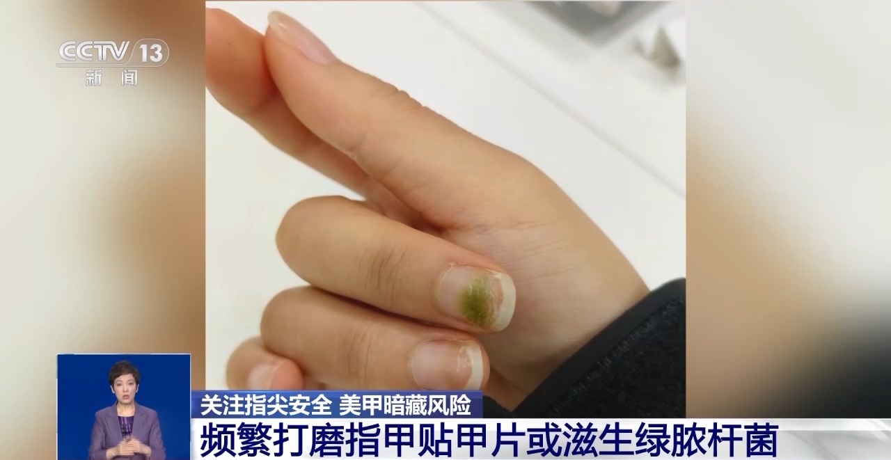 首都医科大学附属北京友谊医院皮肤性病科副主任医师 于欣:这个细菌其实是一个条件致病菌,它特别喜欢潮湿。频繁地做美甲打磨指甲,然后戴上甲片之后,甲片它可能就是粘得不是特别牢固。这时候水蒸气还有一些脏东西会进去,那么这个地方就形成了一个密闭的潮湿的环境,绿脓杆菌就特别喜欢这样的环境,所以它就会大量繁殖,形成一个感染,也就是我们说的绿指甲。