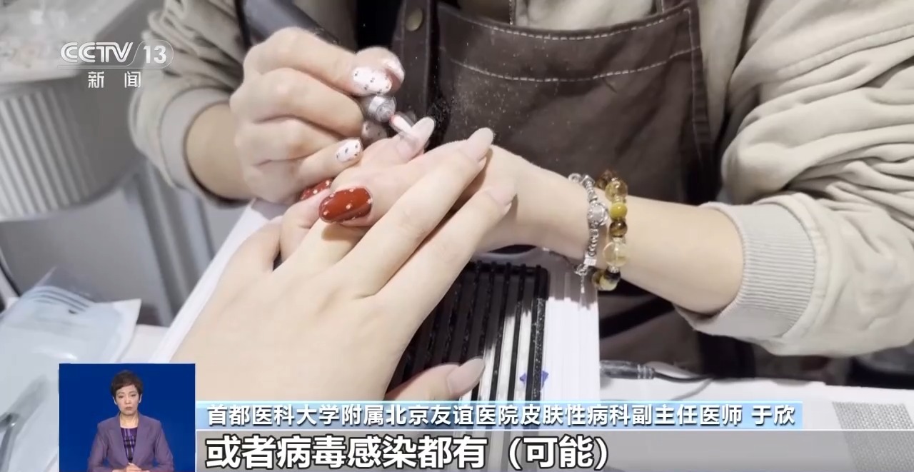 首都医科大学附属北京友谊医院皮肤性病科副主任医师 于欣:我们在做美甲的过程中,它是对皮肤屏障的一种伤害,指甲表面的这种保护屏障它没有了,可能会出现一个感染的现象。这种感染可能会是细菌感染、真菌感染或者病毒感染。HPV病毒感染也可能通过美甲来传播。HPV这个病毒它十分顽强,即使没有什么营养,它也可以活两三天,所以在美甲过程中,它可能通过我们皮肤的一些小的创面,进入到我们这个体内,形成一个甲周疣,这种是非常难治的。