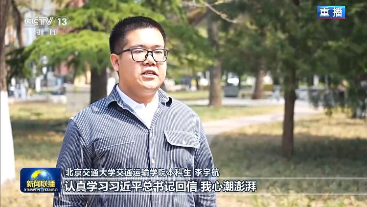 北京交通大学交通运输学院本科生 李宇航:认真学习习近平总书记回信我心潮澎湃。我们要以青春行动接续传承,赓续交大报国传统,深耕交通领域前沿研究,努力把青春汗水挥洒在祖国交通事业的第一线。