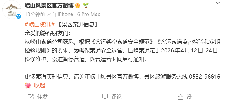 QMG青岛广电4月9日讯 自@崂山风景区官方微博获悉,根据《客运架空索道安全规范》《客运索道监督检验和定期检验规则》的要求,为确保索道安全运营,巨峰索道定于2026年4月12日-24日检修维护,索道暂停营运,恢复运营时间另行通知。