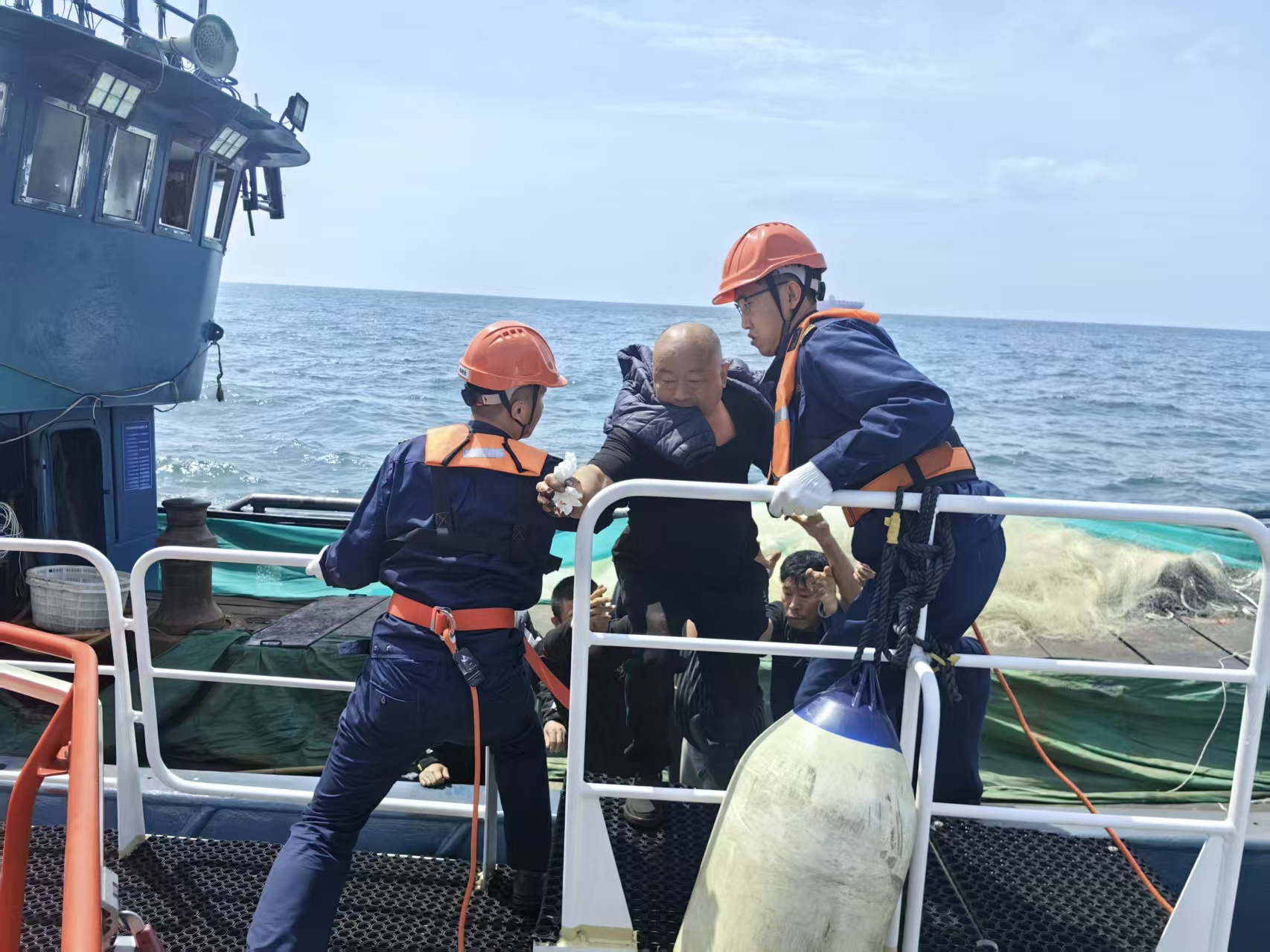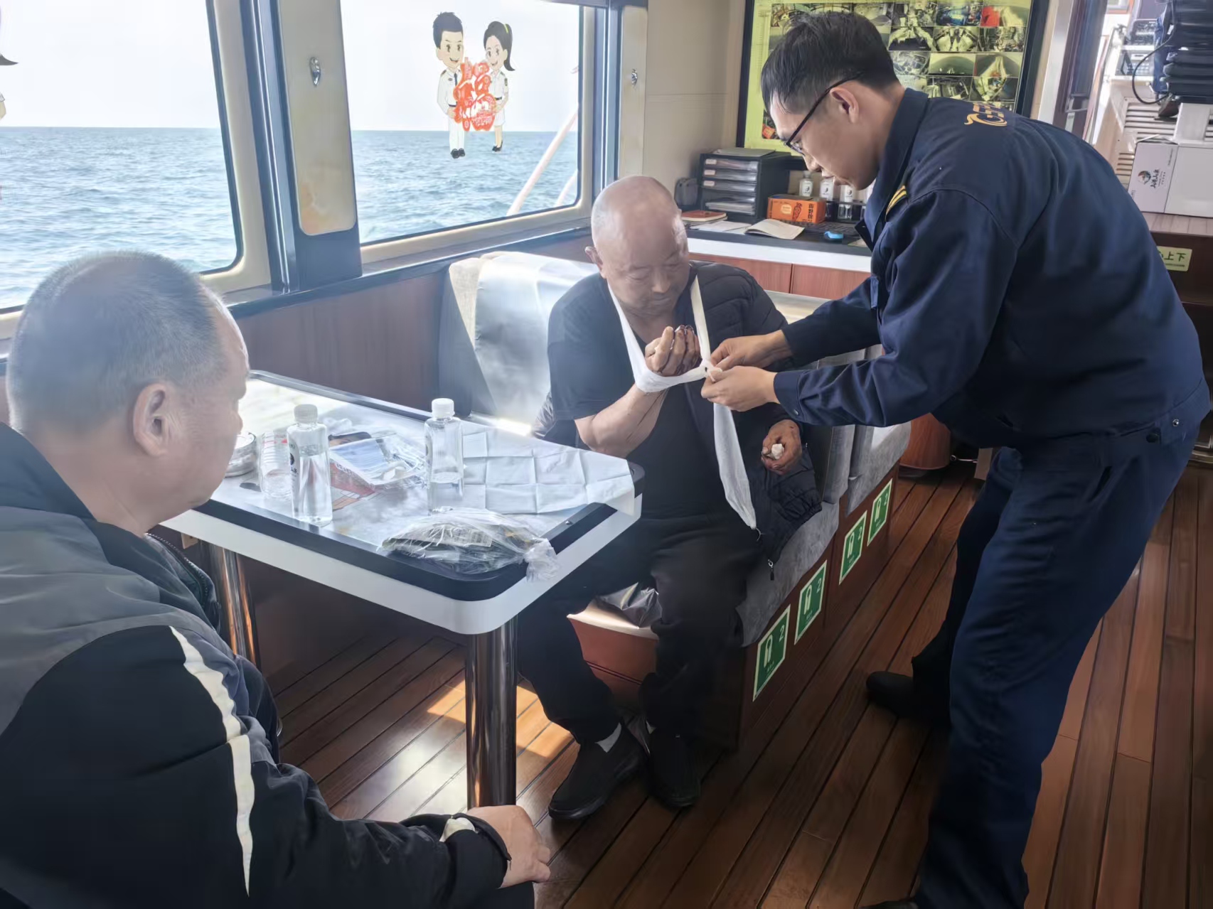 11时30分,“新迎宾”轮顺利抵达预定转运海域,船长结合现场实时海况及渔船航行状态,灵活调整船舶航向与行驶速度,精准找到安全平稳对接位置,规范稳妥转运受伤渔民。伤员登轮后,船员立即使用预先备好的酒精、纱布,为伤员简单包扎,最大限度减轻伤员伤痛。随后,“新迎宾”轮全速返航。