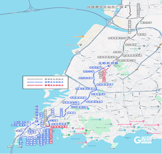 主站为观城路停车场,副站由铁路青岛北站东广场变更为北岭杭州路,调整后为观城路停车场—北岭杭州路。