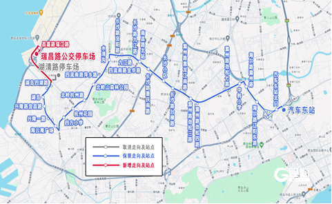 主站由汽车东站调整为瑞昌路公交停车场,副站由湖清路停车场调整为汽车东站,调整后为瑞昌路公交停车场—汽车东站。
