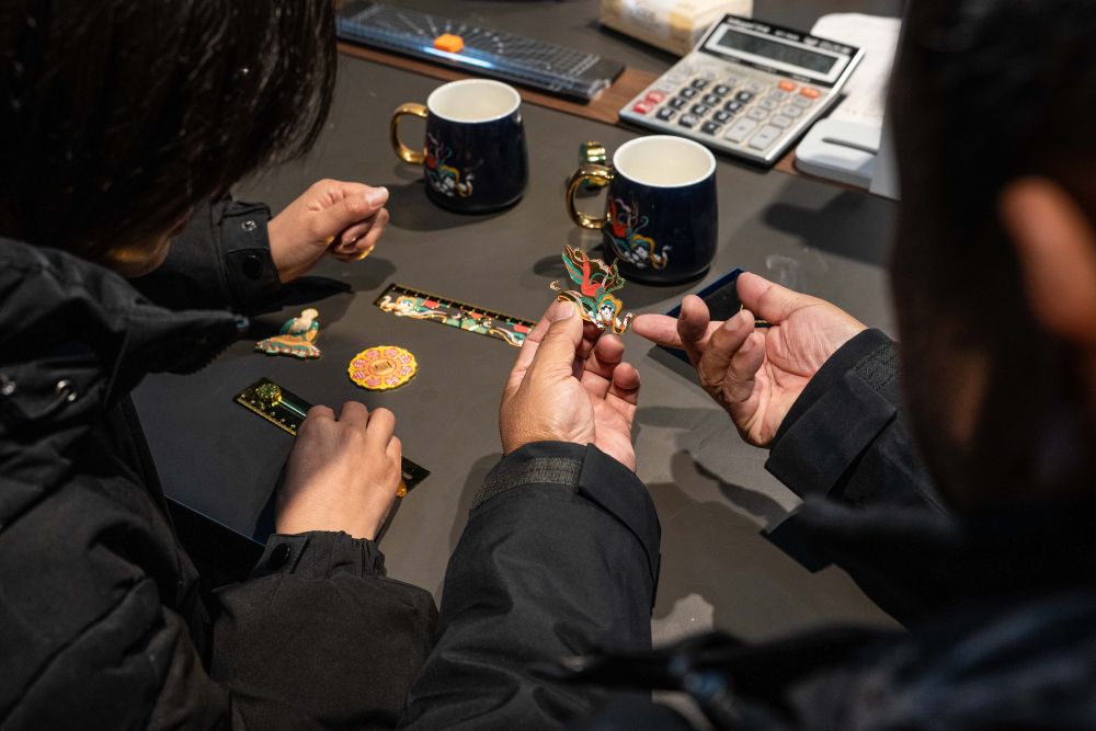 2026年1月15日,云南丽江白沙壁画博物馆馆长杨志坚(右)与同事讨论文创产品设计。近年来,白沙壁画博物馆持续推动白沙壁画赴广东、上海等地展览,主持编纂画册,并推进数字化采集和文创开发,让壁画艺术以新的形式走进人们的日常生活。