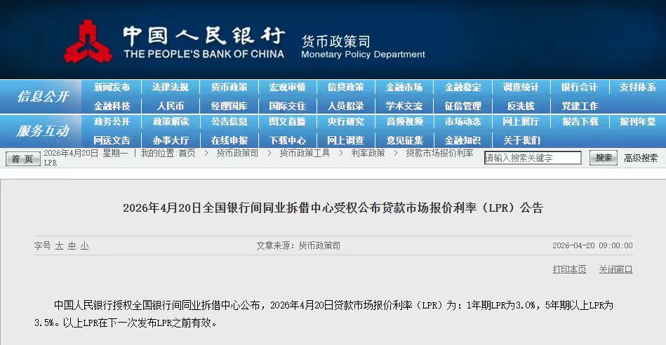 央视财经(记者 吴哲钰)中国人民银行授权全国银行间同业拆借中心公布,2026年4月20日贷款市场报价利率(LPR)为:1年期LPR为3.0%,5年期以上LPR为3.5%,均维持不变。
