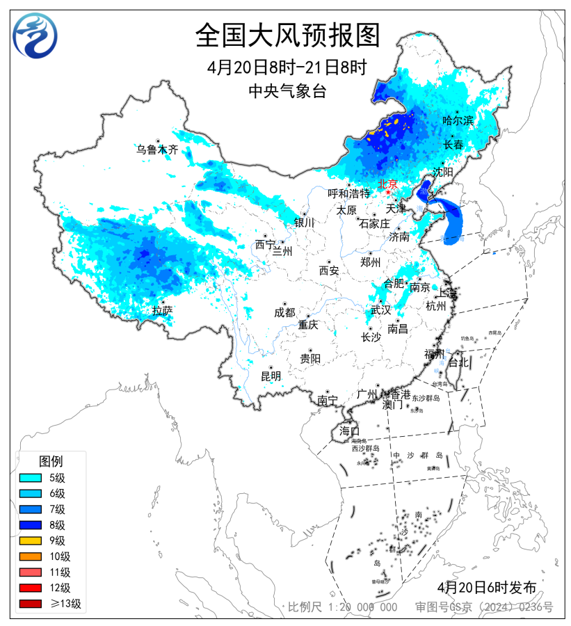预计,4月20日8时至21日8时,新疆沿天山地区和南疆盆地、西藏大部、青海大部、甘肃河西、内蒙古中东部、东北地区大部、河北北部、北京、天津、山东半岛、苏皖大部、湖北东部等地部分地区有5~7级风,阵风8~9级,其中新疆东部山口、西藏北部、内蒙古中部局地有8~9级风,阵风10级以上;渤海、渤海海峡、黄海北部海域、黄海中西部和西南部部分海域将有7~8级、阵风9级的大风。